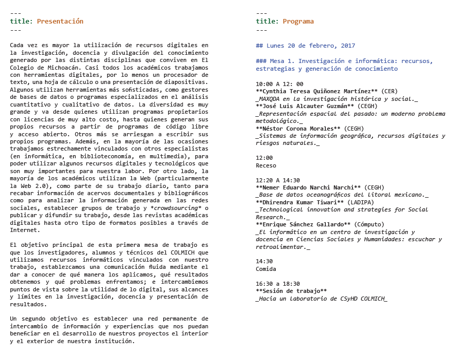 No obstante lo incompleto, The Programming Historian en español merece mucho la pena ser visitado porque contiene -por ahora solamente-, la Introducción a Python, un conjunto de tutoriales pensados para estudiarse de manera seriada que permite a los historiadores aprender los rudimentos de ese lenguaje de programación de alto nivel multipropósito. Muchos colegas historiadores y humanistas se preguntarán aquí, «¿para qué nos sirve saber esas cosas que les competen a los encargados de cómputo de mi institución?»
