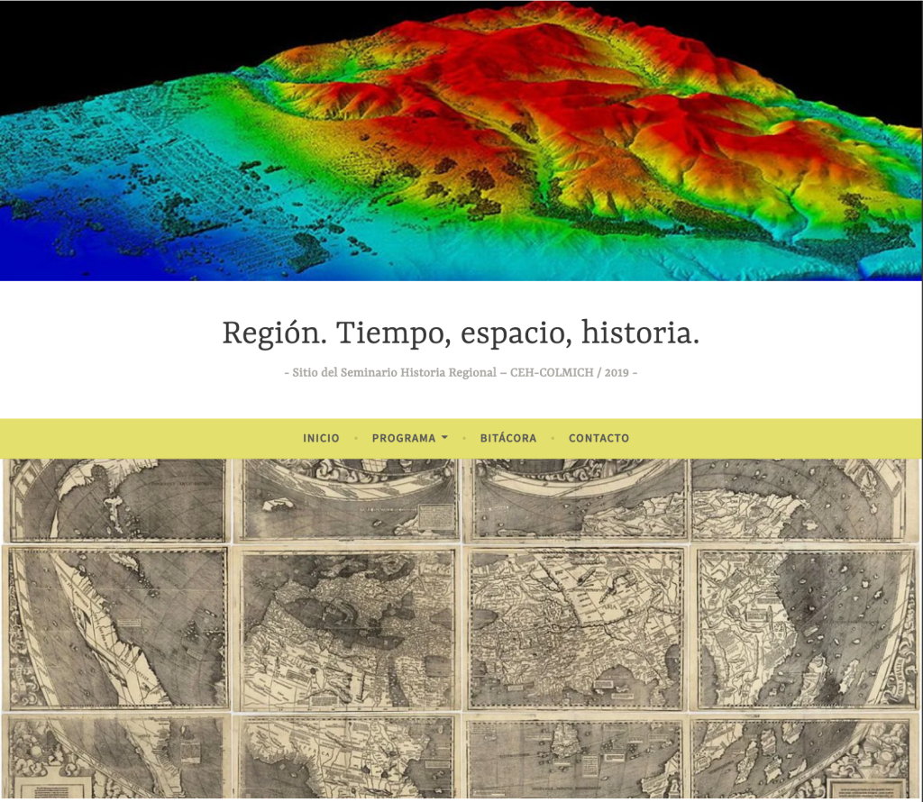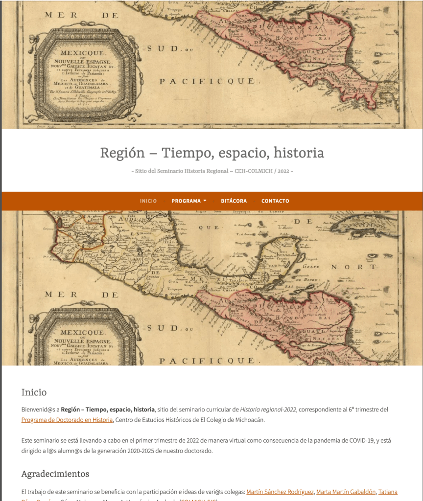 Tratando de modernizar y encontrar mejores espacios para la experiencia de enseñanza~aprendizaje mediante la utilización de los recursos de la historia digital en el momento final (?) de la pandemia de COVID-19, el Seminario de Historia regional que imparto en el programa de doctorado del Centro de Estudios Históricos de El Colegio de Michoacán volvió a contar con un sitio Web particular. Una nueva versión de Región ~espacio, tiempo, historia está disponible en línea y se beneficia con la construcción, por parte de las personas que conforman la generación 2020-2025, de sus diversos proyectos de trabajo elaborados también en línea.